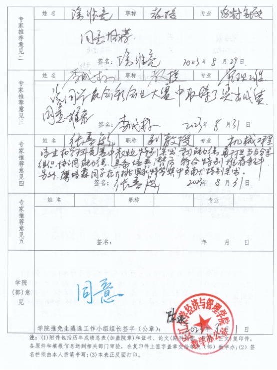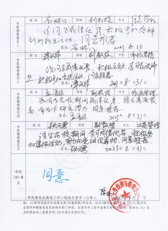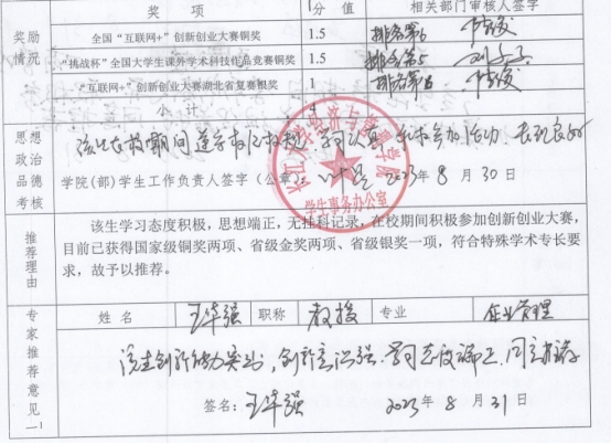 冯硕,男,学号202003175,学院信息管理与信息系统专业本科生。获得全国“互联网+”创新创业大赛铜奖 、“挑战杯”全国大学生课外学术科技作品竞赛铜奖和“互联网+”创新创业大赛湖北省复赛银奖;廖培霖,男,学号202004912,学院金融学本科生。获得第八届“互联网+”大学生创新创业国家金牌、第十三届“挑战杯”大学生创业计划竞赛国家银奖和第八届“互联网+”大学生创新创业省银奖。根据《det365官方网站登录推荐优秀应届本科毕业生免试攻读硕士学位研究生管理办法(试行)》(长大校发 〔2020〕106号)和关于做好推荐2024届优秀本科毕业生免试攻读硕士学位研究生工作的通知》等文件精神和通知要求,9月1日13:00-13:30在文科大楼417开展特殊学术专长答辩会,经答辩决定同意冯硕和廖培霖进行2024届研究生推免申请(不是正式推免)。 现通过det365官方网站登录网站主页予以公示,公示日期为2023年9月1日至2023年9月3日,如有异议,请于2023年9月3日前与学院教学办联系,电话:0716-8060985。先将材料公示如下:
