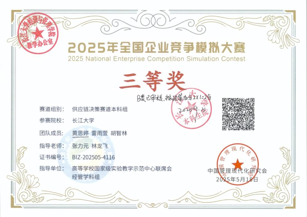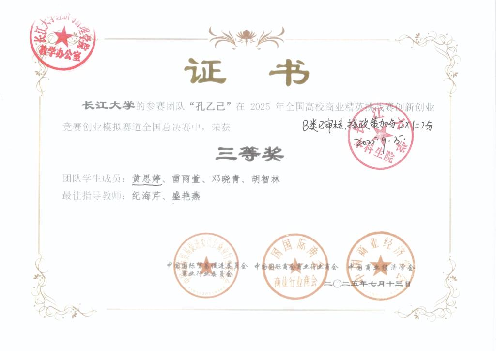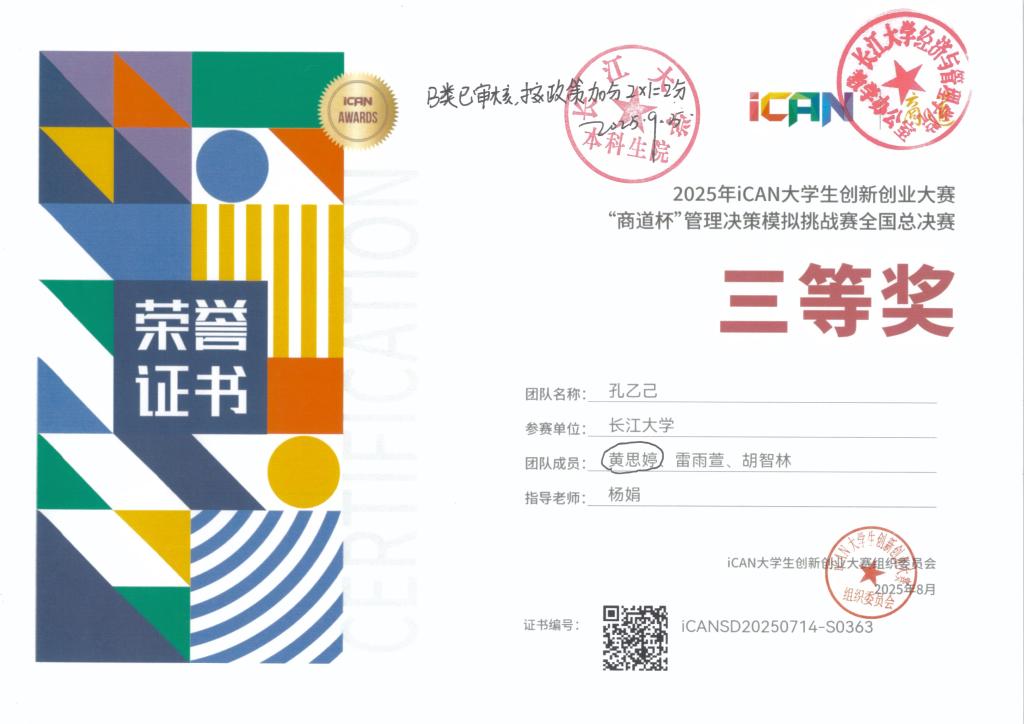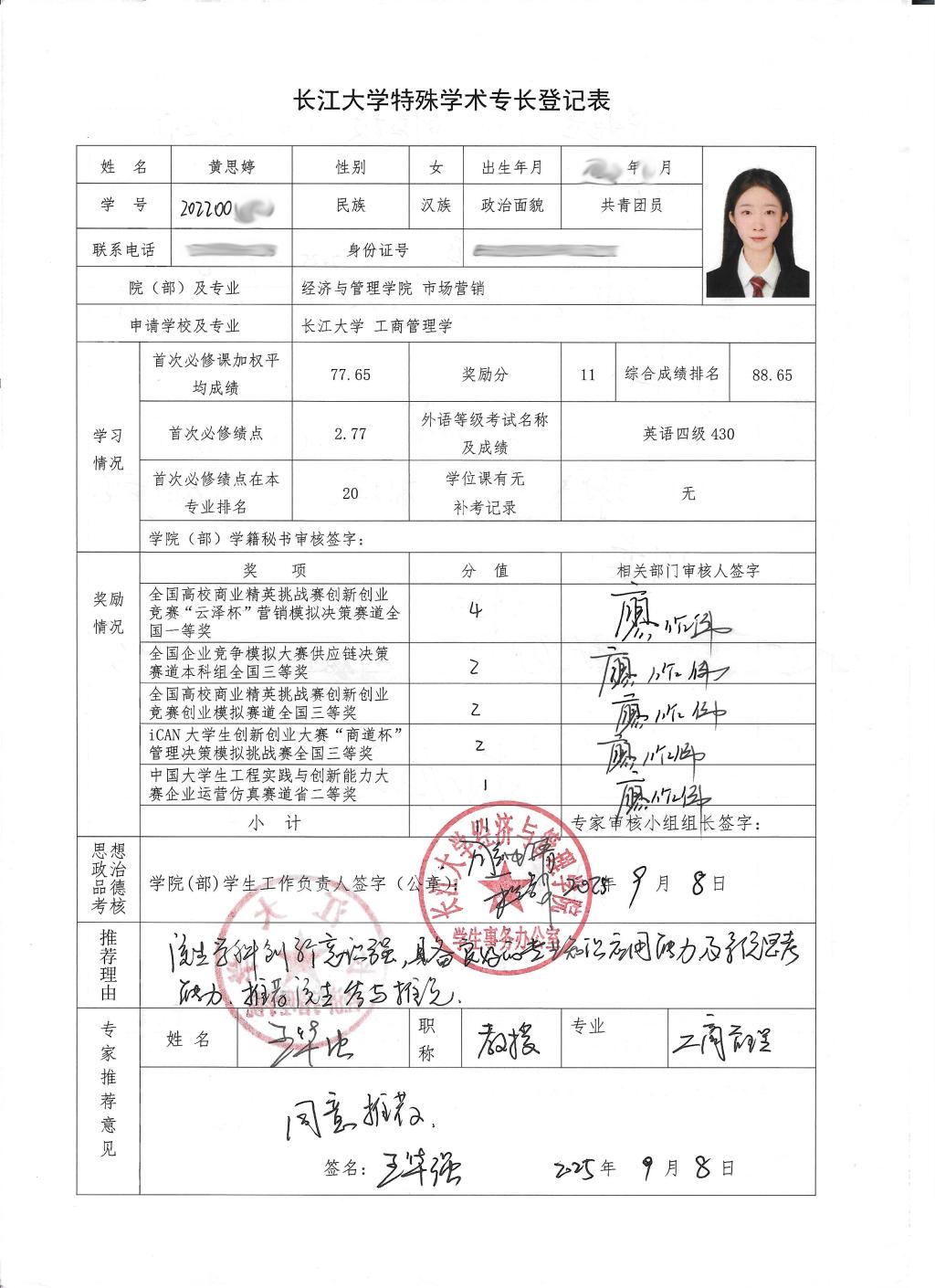 黄思婷,女,学号202200****,det365官方网站登录市场营销专业本科生。获得2025年全国企业竞争模拟大赛三等奖 、2024年全国高校商业精英挑战赛一等奖、第九届湖北省中国大学生工程实践与创新能力大赛二等奖、2025年ican大学生创新创业大赛全国三等奖、2025年全国高校商业精英挑战赛三等奖。根据《det365官方网站登录推荐优秀应届本科毕业生免试攻读硕士学位研究生管理办法》(长大校发 〔2025〕9号)和《关于做好推荐2026届优秀本科毕业生免试攻读硕士学位研究生工作的通知》等文件精神和通知要求,9月8日19:30-20:00在文科大楼416开展特殊学术专长答辩会,经答辩决定同意黄思婷进行2026届研究生推免申请(不是正式推免)。 现通过det365官方网站登录网站主页予以公示,公示日期为2025年9月10日至2025年9月12日,如有异议,请于2025年9月12日前与学院教学办联系,电话:0716-8060985。现将材料公示如下:
